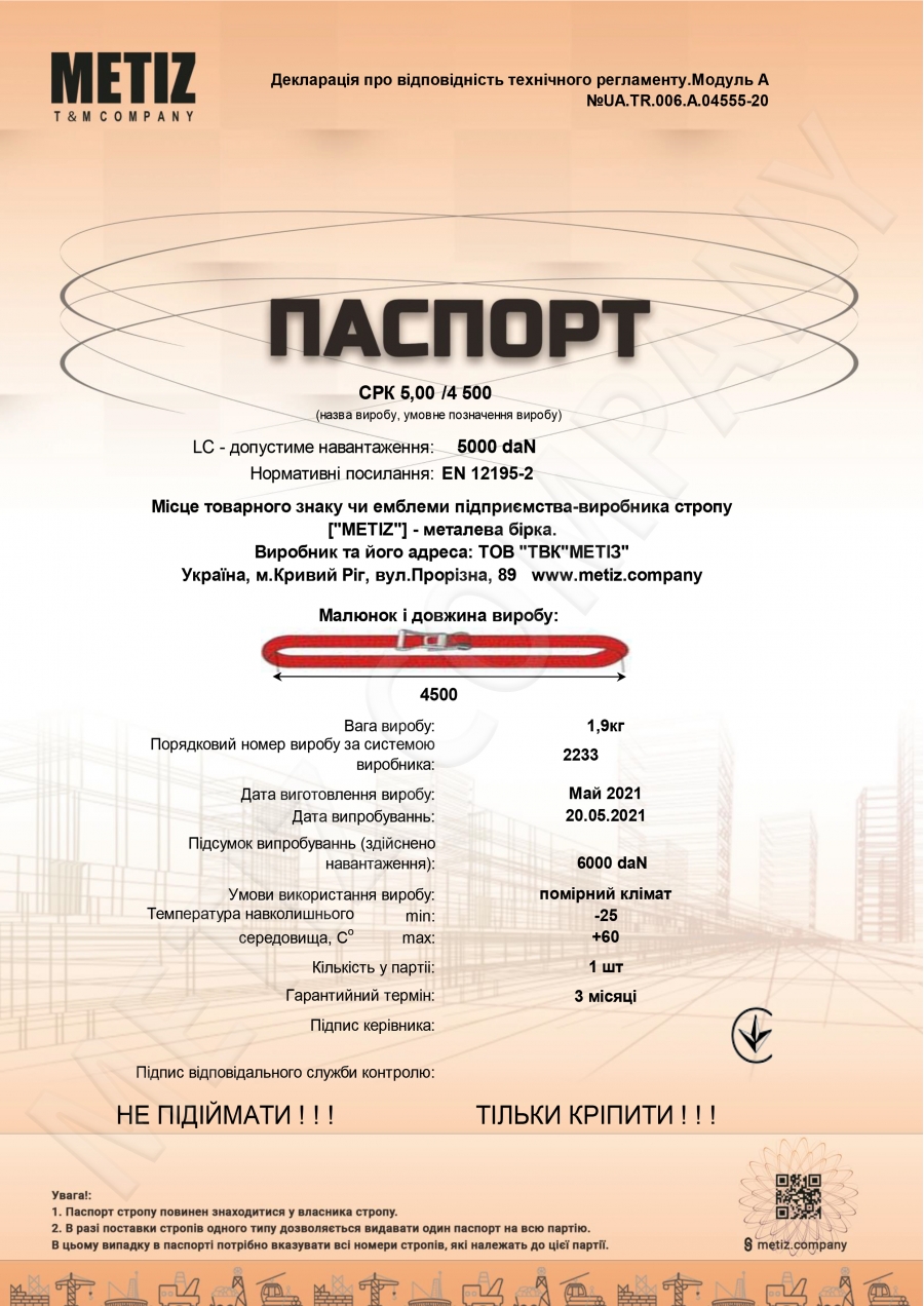 - Критичне робоче навантаження (обхват): 5000 daN / 5 т