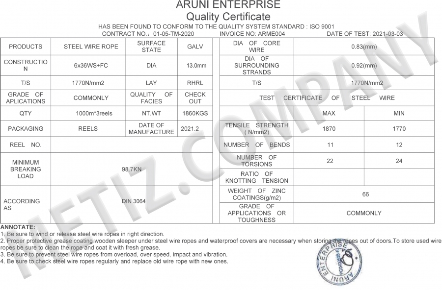 - Конструкція: 6х36WS 6x (1 + 7 + 7/7 + 14) +1 FC