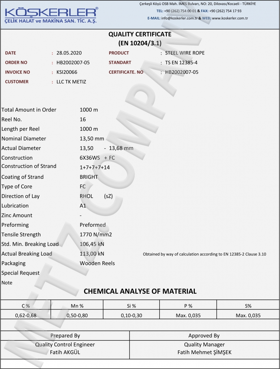 - Конструкція: 6х36WS 6x (1 + 7 + 7/7 + 14) +1 FC