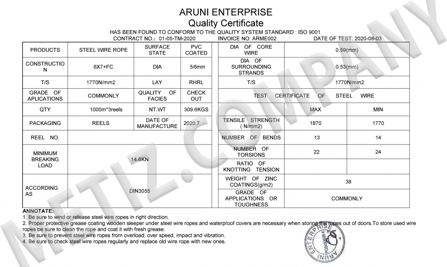 - Конструкція: 6x7 (1 + 6) +1 FC PVC